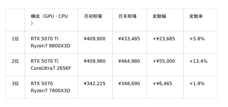 ・人気構成の RTX 5070 Ti + Ryzen7 9800X3D は約2.4万円値上げ(+5.8%)