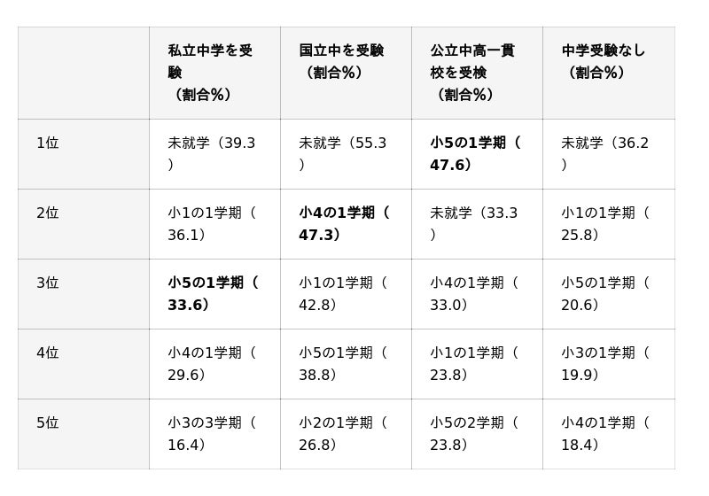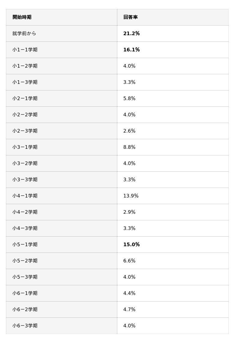 「就学前から(21.2%)」。次に「小1の1学期(16.1%)」「小5の1学期(15.0%)」と続きます。