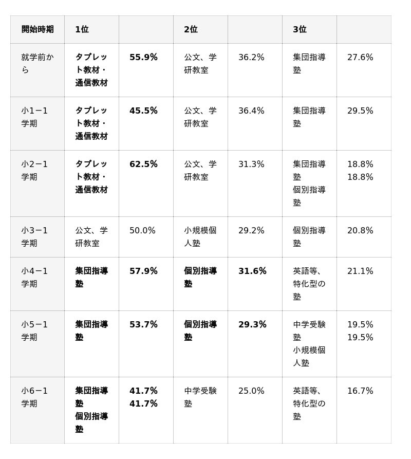 本調査では、「小学生の時点で子どもに教育サービスを利用させていた」保護者に対し、利用開始時期を尋ねました。回答率が高い順に、