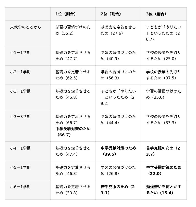 教育サービスを利用し始めた時期別に、きっかけや理由を分析しました。冒頭で示したデータと同様に、各学年の1学期を対象に集計しています。また、都市部で「私立中学受験対策を始めるタイミング」とされる、小3の3学期も加えました。