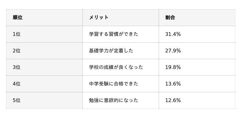 塾などの教育サービスを利用して「良かった」と感じたこと、あるいはメリットには、どのようなものがあるでしょうか。スタート時期を問わず、「小学生のうちに子どもに教育サービスを利用させた経験がある」保護者が感じるメリット上位は、以下の通りでした。