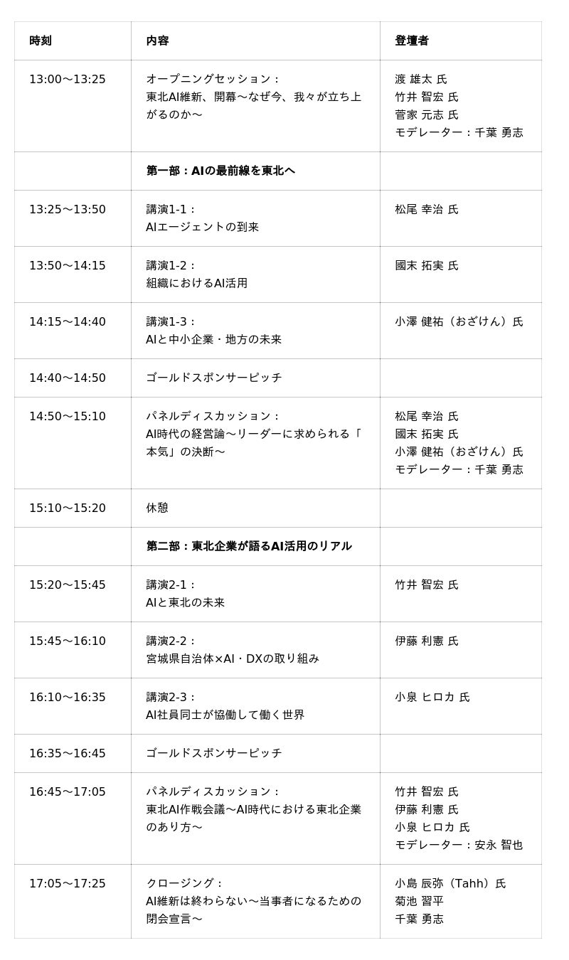 当日は現地約100名、オンライン約200名の参加を予定しており、東北地域でAIに特化した大規模カンファレンスを実施するのは初の試みです。