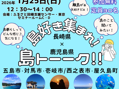 長崎県五島市は、1月23日「ながさきナイトサロン」、1月24日「九州・山口・沖縄移住フェア『暮らシゴト2026』」、1月25日「長崎県×鹿児島県 島好き集まれ!島トーーク!!」に参加します。