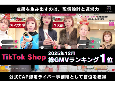 ライブコマース事業、ブランド事業、AI事業などを展開し、日常と未来を彩る最高の体験を創造する株式会社Sホールディングス(本社:東京都品川区、代表取締役CEO: 燕 咏靖)は、当社が運営するライブコマースに特化した事務所「S-LIVE JAPAN」が、2025年12月におけるTikTok ShopのCAP(クリエイターエージェンシーパートナー)認定ライバー事務所を対象とした総GMV(流通総額)ランキングにおいて、1位を獲得したことをお知らせいたします。本成果は、所属ライブコマーサーの発信力に加え、視聴者データや購買傾向を踏まえた配信設計、ならびに運営・マネジメント体制が一体となって機能した結果によるものです。