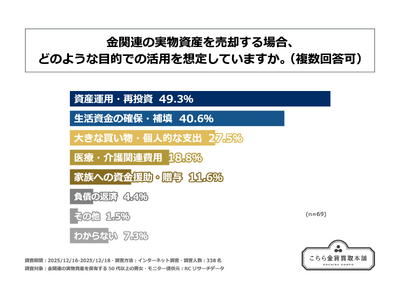 また、今後、保有している金関連の実物資産を売却する意向があると回答された方に「金関連の実物資産を売却する場合、どのような目的での活用を想定しているか」を尋ねる設問への回答では、1位が「資産運用・再投資」で49.3%、2位が「生活資金の確保・補填」で40.6%、3位が「大きな買い物・個人的な支出」で27.5%という結果になりました。この結果から、金関連の実物資産を保有する50代以上の人が、金関連の実物資産を売却する場合に想定している最大の目的は「資産運用・再投資」であることが明らかになりました。
