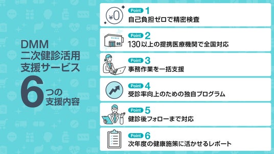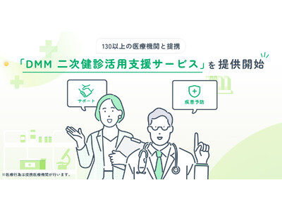 合同会社DMM.com(本社:東京都港区、イノベーションカンパニーCEO:緒方悠、以下DMM)が展開するDMMヘルスケアは、130以上の医療機関と提携し、厚生労働省の給付制度を活用することにより※1、企業の費用負担なく、従業員の生活習慣病リスク対策につなげる「DMM 二次健診活用支援サービス」の提供を開始しました。