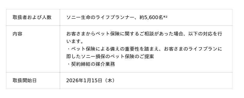 ソニー生命保険株式会社(代表取締役社長:高橋 薫、以下「ソニー生命」)は、2026年1月15日よりライフプランナー(営業社員)によるソニー損害保険株式会社(代表取締役社長:坪田 博行、以下「ソニー損保」)のペット保険の取扱を開始します。