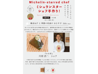 「空堀おにぎり(おびむす)」では2024年8月より、ミシュランスターシェフが調理した具材を使用したおむすびを月替りで提供しております。2024年8月の「日本料理 翠 大屋」(天満)大屋シェフを皮切りに、「老松 喜多川」(西天満)喜多川シェフ、「Chi-Fu」(西天満)の東シェフ、「agnel d'or 」(阿波座)藤田シェフ、「料理屋 まえかわ」(京都 清水五条)前川シェフ、「弧柳」(北浜)松尾シェフ、「La Terrasse irisee」(奈良市 菖蒲池)鷦鷯シェフ、「RiVi」(京町堀)山田シェフ、「日本料理 楽心」(新福島)片山シェフ、「和食 いいくら」(南森町)飯倉シェフ、「料理屋 稲家」稲家シェフ、その他多くのシェフより、和洋中の垣根を超えて本企画へのご参加をご承諾いただきました。大阪だけではなく奈良・京都など関西圏の多種多様なミシュランの味をおむすびで楽しんでいただけます。ミシュランスターシェフが実際に調理した具材を使用するため販売開始より100食の完全数量限定での提供となります。