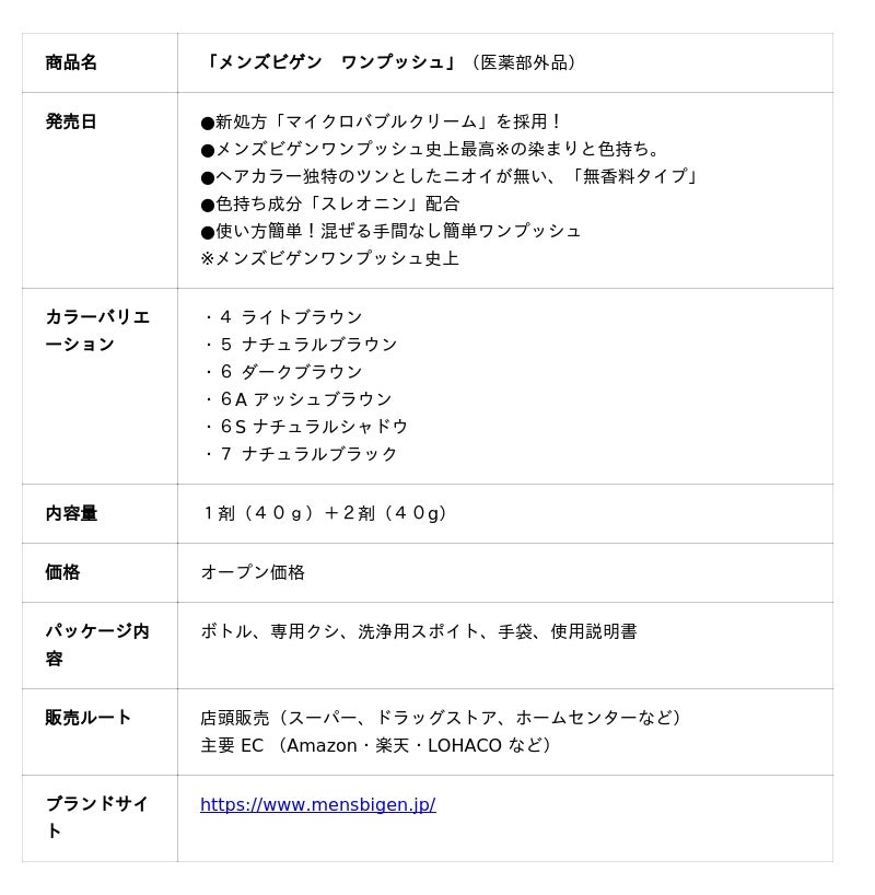 ホーユー株式会社(本社:愛知県名古屋市、代表取締役 社長執行役員:佐々木 義広、以下ホーユー)は、白髪男性市場の拡大と更なる顧客満足度向上を目指し、男性白髪染め市場売上No.1※を誇る「メンズビゲンワンプッシュ」を2026年1月16日(金)よりリニューアルいたします。