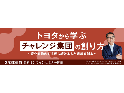 累計20,000社450万人以上の組織開発・人材育成を支援するALL DIFFERENT(オールディファレント)株式会社(所在地:東京都千代田区 代表取締役社長:眞崎大輔)は、スペシャルセミナーを2月20日(金)に開催いたします。本講演では、元トヨタ自動車 レクサスブランドマネジメント部長であり、A.T. Marketing Solution代表の高田 敦史氏をお招きし、「トヨタから学ぶ“チャレンジ集団”の創り方~変化を恐れず挑戦し続ける人と組織を創る~」というテーマでお話しいただきます。