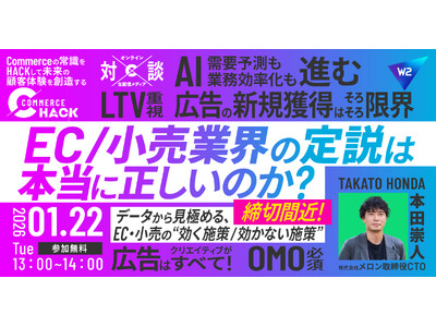 “EC/小売業界の定説は本当に正しいのか?データから見極める、EC・小売の“効く施策/効かない施策”をテーマとしたライブプログラムが、2026年1月22日(木)13:00より配信されます。本プログラムに、株式会社メロン(本社:東京都文京区、代表取締役:三橋勇太)CTOの本田が登壇し、