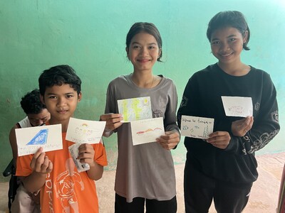 三島竹島のメッセージカードを受けとるカンボジアの子どもたち