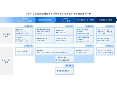 従来、当社がマンション管理事業者向けに提供してきたBPOサービスは、電話やメールなどの問い合わせ窓口や書類のチェック・作成といった「日常管理サポート業務」が中心でした。今回、人材不足や働き方改革の事業課題を解決する業務DX支援を目的に、「顧客獲得マーケティング業務」「組合委託契約業務」「生活支援サービス業務」「資産価値向上施策」を支援メニューに加え、マンションの長期的なライフサイクルに寄り添った幅広い業務へ支援領域を拡大します。