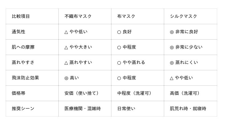 A. 肌への優しさでは布マスク(特にシルク素材)が優れていますが、感染予防効果とのバランスを考える必要があります。