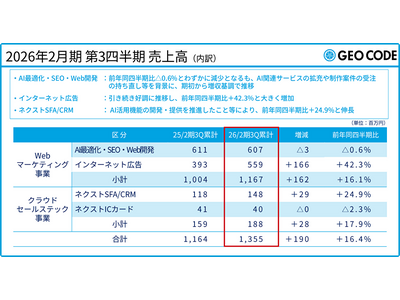 Webマーケティングとクラウドセールステック事業を展開する株式会社ジオコード(本社:東京都新宿区、代表取締役:原口 大輔、証券コード:7357)は、2026年1月14日(水)に2026年2月期第3四半期の決算を発表しました。