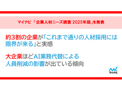 約3割の企業が「これまで通りの人材採用には限界が来る」と実感。AI業務代替による人員削減、5社に1社以上は「今後影響がありそう」。大企業ほどAI業務代替による人員削減の影響が出ている傾向株式会社マイナビ(本社:東京都千代田区、代表取締役 社長執行役員:粟井俊介)は、全国の採用担当者2,101名を対象に実施した、「企業人材ニーズ調査 2025年版」の結果を発表しました。【TOPICS】◆人材採用について、「これまで通りの採用にはそろそろ限界が来る」企業は33.8%。特に医療・福祉、生活関連サービス業種で採用への危機感が強い傾向【図1、2、3】◆企業の採用充足状況、新卒・中途・アルバイトで約4割が未充足。新卒・中途で未充足割合が増加【図4】◆AIの業務代替による人員削減、「既に人員削減への影響が出ている」企業は12.3%。大企業ほど「既に影響が出ている」傾向【図5、6】◆人材採用について、「これまで通りの採用にはそろそろ限界が来る」企業は33.8%。特に医療・福祉、生活関連サービス業種で採用への危機感が強い傾向企業の採用担当者に2025年の人材採用状況を聞いたところ、「これまで通り採用できている」割合は46.3%だった。一方、「これまで通りの採用にはそろそろ限界が来る」と回答した割合は33.8%、「これまで通りの採用には既に限界が来ている」割合は10.5%となり、採用への危機感がうかがえた。業種別では、特に[医療・福祉][生活関連サービス※]で採用が難しくなりつつある様子がうかがえ、さらに企業規模が小さいほどこれまで通りの採用が難しい傾向がみられた。人口減少や労働力不足を背景に人材確保が難しくなっている現状がうかがえる。これまで通りの採用が難しい人材の自由回答では、「新卒」「若手」の回答が目立ち、若年層のニーズの高さがうかがえた。また、[IT・技術者][看護・介護]など特定の専門性を備えた人材や、「即戦力」「経験者」など実務の経験値に対するニーズもみられた。【図1、2、3】※クリーニング、理美容、娯楽施設など【図1】【図2】【図3】◆企業の採用充足状況、新卒・中途・アルバイトで約4割が未充足。新卒・中途で未充足割合が増加2025年の採用計画における充足状況を聞いたところ、「採用数を確保できていない」割合は、新卒採用担当者で40.6%、中途採用担当者で44.6%、アルバイト採用担当者で37.3%となった。3種のうち中途採用が最も高いが、いずれの雇用形態においても4割程度が「採用未充足」の状況にある。一方で、前年比で見ると「採用数を確保できていない」割合は「新卒採用担当者(前年比2.3pt増)」、「中途採用担当者(前年比2.1pt増)」で微増、「アルバイト採用担当者(前年比0.9pt減)」が微減となった。【図4】【図4】◆AIの業務代替による人員削減、「既に人員削減への影響が出ている」企業は12.3%。大企業ほど「既に影響が出ている」傾向AIによる業務代替の影響により、自社で現在雇用している従業員の人員削減の可能性について聞いた。「既に人員削減への影響が出ている」企業は12.3%だった。「現時点で人員削減への影響は出ていないが、今後は影響がありそう」と回答した割合は22.9%、「現時点で人員削減への影響は出ていないが、今後はわからない」は34.2%であった。一方、「人員削減への影響はないだろう」と回答した割合は30.7%だった。業種別では、 [宿泊業・飲食店][教育業][医療・福祉][建設業]などで「人員削減への影響はない」が高かった。これらの業界は人手不足が深刻な傾向にあり、人を通じた仕事やサービスの提供が必要とされる職種が多いことが考えられる。企業規模別で見ると、従業員1000人以上の企業ではAIの業務代替による人員削減において、「既に影響が出ている」が16.2%となり、企業規模が大きいほど影響が出ている傾向が見られた。大企業ほど、AI導入が進んでおり、AIによる業務代替が先行していると推察される。【図5、6】【図5】【図6】【調査担当者コメント】今回の調査からは、企業における労働力不足への認識と、採用に対する危機感がうかがえました。特に中小企業や[医療・福祉]などの業界で、必要な人材の確保が一層難しくなっていることが考えられます。一方、労働力不足を技術で補おうとする動きも見受けられました。特に大企業ではAIによる業務代替の影響があらわれており、その結果として労働力に『余剰感』が生じている企業もあるようです。既に組織で求められる仕事のあり方や、社会の労働需給のバランスが変化しているのかもしれません。今後、さらに人口減少が進み労働力が限られていく中で、企業においては、人が担うべき仕事を見極めながら技術を適切に取り入れる姿勢や、雇用形態や属性を限定せずに多様な人材に目を向けることも重要になると考えられます。また、働く個人にとっては、社会の変化に合わせて新たなスキルを身につける視点も求められるでしょう。マイナビキャリアリサーチラボ 研究員 宮本 祥太【調査概要】マイナビ「企業人材ニーズ調査 2025