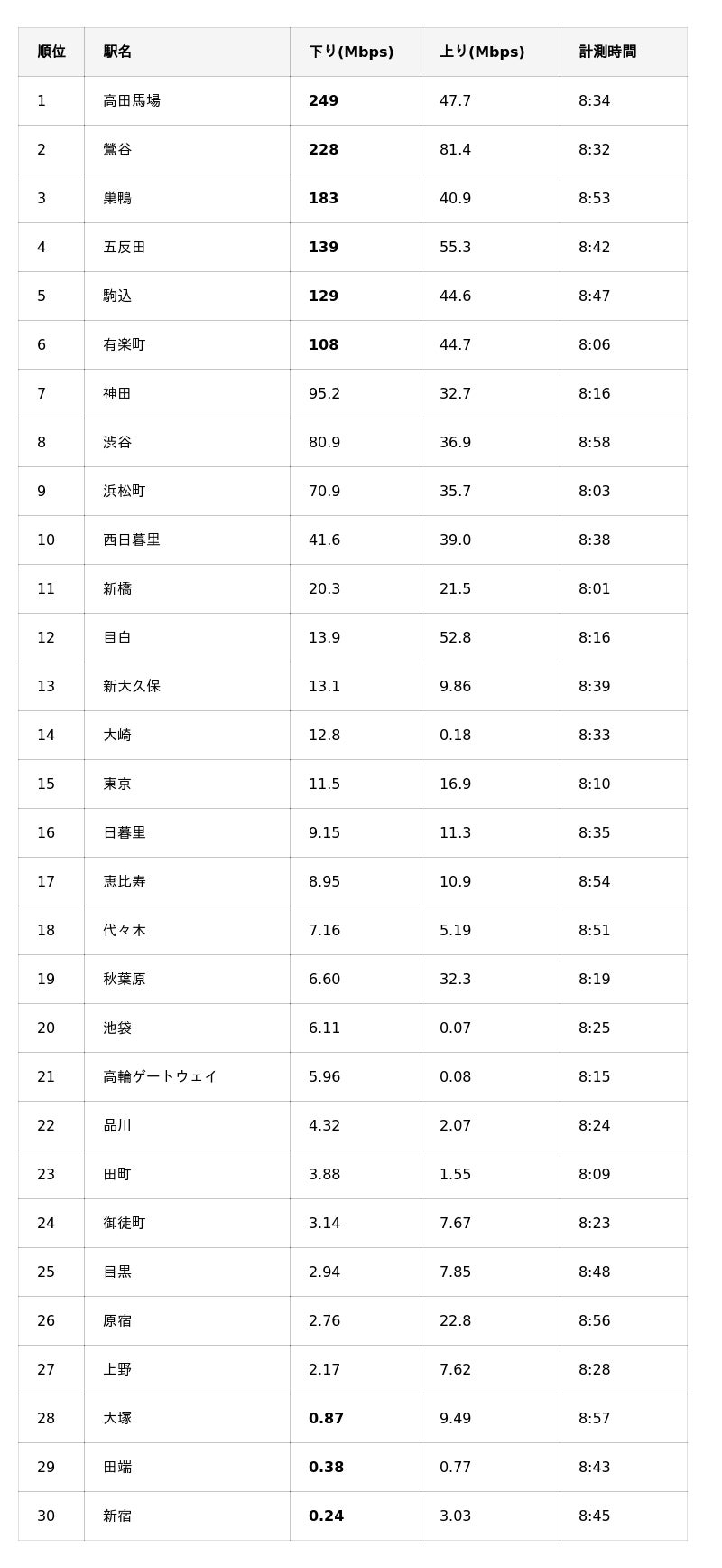 ・最速駅:高田馬場(249Mbps)