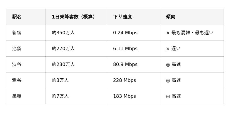 ・主要ターミナル(新宿・池袋)は混雑・ビル環境で低速