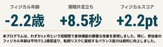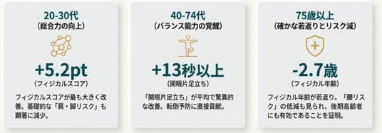 通常、1年単位で機能低下が進む70代・80代においても、数値の低下を食い止め、フィジカル年齢を-1.1歳改善、または現状維持することに成功しました。
