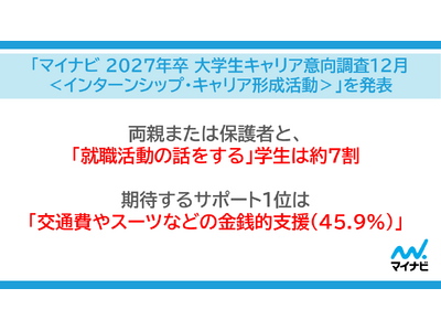 インターンシップは「適職を知るための機会」と捉える学生が最多。両親または保護者と、「就職活動の話をする」学生は約7割。期待するサポート1位は「交通費やスーツなどの金銭的支援(45.9%)」株式会社マイナビ(本社:東京都千代田区、代表取締役 社長執行役員:粟井俊介)は、2027年卒業予定の全国の大学生、大学院生を対象に実施した、「マイナビ 2027年卒 大学生キャリア意向調査12月<インターンシップ・キャリア形成活動>」の結果を発表しました。<TOPICS>◆ 12月のキャリア形成活動参加率は60.4%で、前月と同水準。インターンシップは「適職を知るための機会」と捉える学生が最多【図1、2】◆ 両親・保護者に期待するサポート1位は「交通費やスーツなどの金銭的支援(45.9%)」。「励ましなど精神的サポート」「あまり気を遣わないような雰囲気や環境づくり」も上位に【図3】◆ 年末年始など長期休暇に実家へ帰省したい学生は約9割、帰省中に就職活動の相談をしたい学生は6割。意見を聞く理由は「自分のことをよく知っていて、一意見として取り入れたいから」【図4、5、6】【調査概要】◆12月のキャリア形成活動参加率は60.4%で、前月と同水準。インターンシップは「適職を知るための機会」と捉える学生が最多12月のキャリア形成活動に参加した学生の割合は60.4%で、前月(60.3%)と同水準だった。各プログラム別にみても、参加率はいずれも前月と同程度で、秋から冬にかけて大きな変化はみられない。また、インターンシップへの参加はどのような位置づけかを聞いたところ、「適職を知るための機会(21.5%、前年比1.3pt減)」が前年に続き最も多く、次いで「早期選考(広報活動開始3/1よりも前の選考)に参加するための機会(18.2%、前年比5.0pt増)」「就職活動に向けた準備の場(16.3%、対前年比0.1pt減)」が続いた。学生が将来のキャリアを主体的に構想するための探索的な機会として、これらの活動を捉えている様子がうかがえる。【図1、2】【図1】【図2】◆ 両親・保護者に期待するサポート1位は「交通費やスーツなどの金銭的支援(45.9%)」。「励ましなど精神的サポート」「あまり気を遣わないような雰囲気や環境づくり」も上位に両親・保護者に求めるアドバイスやサポートについて聞くと、最も多かった回答は「交通費やスーツなどの金銭的支援(45.9%)」で、就職活動に伴う費用が学生にとって負担となっている現状がうかがえる。そのほか、「励ましなど精神的サポート(39.6%)」「あまり気を遣わないような雰囲気や環境づくり(38.8%)」などが上位にあがった。学生は精神的な励ましや環境面での支援を期待していることがわかる。【図3】【図3】◆年末年始など長期休暇に実家へ帰省したい学生は約9割、帰省中に就職活動の相談をしたい学生は6割。意見を聞く理由は「自分のことをよく知っていて、一意見として取り入れたいから」両親・保護者と同居していない学生に、年末年始など長期休暇に実家へ帰省したいと思うかを聞くと、85.5%が「帰省したい」と回答した。また、こうした休暇期間に両親または保護者と自身の就職活動について「相談したい」と思う学生は60.7%だった。親元を離れて暮らす学生にとって、長期休暇は就職活動やキャリアについて腰を据えて話し合える貴重な場であると考えられる。両親・保護者の意見を参考にしている人にその理由を聞くと、「自分より社会経験も人生経験も積んでいる大人で最も身近で親身に考えてくれる存在だから。(文系女子)」「自分のことをよく知っているし、一意見として取り入れることが大切だと思うから。(文系女子)」などの意見があがった。【図4、5、6】【図4】【図5】【図6】【調査担当者コメント】今回は、キャリア形成活動における学生と保護者との関わり方について調査しました。学生が保護者に求めるサポートは「金銭的支援」や、「落ち着いて活動ができる環境面でのサポート」を求める結果となりました。就職活動の具体的なアドバイスよりも、プレッシャーなどを感じないように安心して挑戦できる環境を求めていることがわかります。一方で、保護者に「相談をしたい」と回答した学生は6割いました。学生から意見を求められた際は、人生の先輩・理解者としてコミュニケーションをとることも学生の支えになると思います。 マイナビキャリアリサーチラボ 研究員 服部 幸佑【調査概要】「マイナビ 2027年卒 大学生キャリア意向調査12月<インターンシップ・キャリア形成活動>」○調査期間/2025年12月20日(土)~12月31日(水)○調査方法/マイナビ2027会員(退会者含む)にWEB DMを配信し、インターネットアンケートより回収○調査対象/2027年3月卒業予定の全国の大学生、大学院生○調査機関/自社調べ○有効回答数/1,001名(文系男子144名 文系女子369名 理系男子246名 理系女子242名)※調査結果は、端数四捨五入の都合により合計が100%にならない場合があります。※調査結果の詳細はこちら(https://career-research.mynavi.jp/reserch/20260115_106132/)