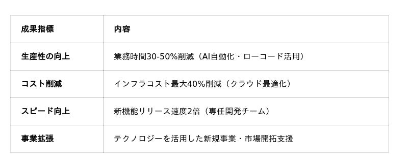 提供するのは人材提供や開発作業そのものではありません。以下のような測定可能な成果を重視しています。