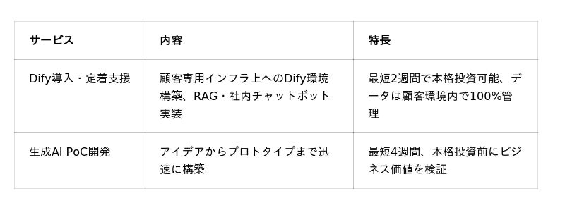- AI共創(Dify導入・定着支援、生成AI PoC開発)