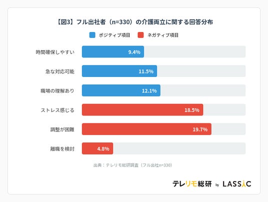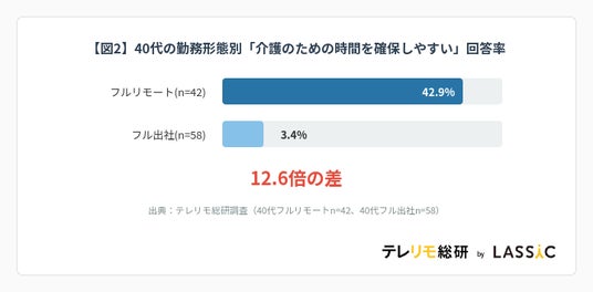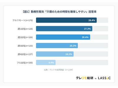 フルリモート勤務者の29.4%が「介護のための時間を確保しやすい」と回答し、フル出社者(9.4%)の3.1倍に達することが、テレリモ総研の調査で明らかになった。