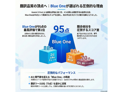 当社が実施したGoogle社の最新AIモデル「Gemini3 Pro」を用いた客観的な品質比較評価(LLM-as-a-Judge)において、『Blue One』は翻訳品質スコアで95点を記録しました。