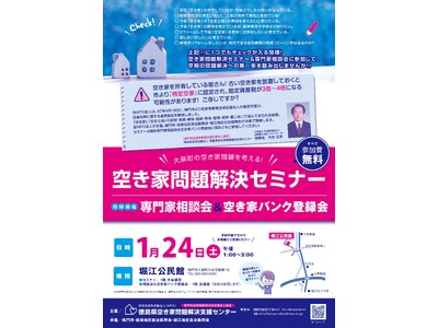 県内初となる空家特措法に基づく「空家等管理活用支援法人」に指定した「NPO法人徳島県空き家問題解決支援センター」主催による「大麻町の空き家問題を考える!空き家問題解決セミナー・専門家相談会・空き家バンク登録会」を実施します。