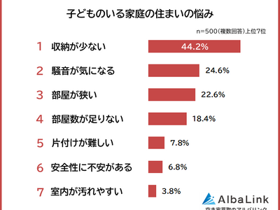 株式会社AlbaLink(本社:東京都江東区、代表取締役:河田 憲二)は、中学生までのお子さんがいる500人を対象に「子どものいる家庭の住まいの悩みに関するアンケート」を実施し、そのデータをランキングにしました。
