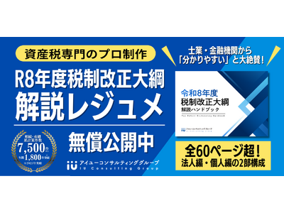 相続・事業承継に特化し、年間約1,800件(累計7,500件以上)の支援実績を持つアイユーコンサルティンググループ(本社:東京都豊島区/代表:岩永 悠、共同代表:出川 裕基 以下当グループ)は、1月21日より「令和8年度税制改正大綱解説レジュメ」(60P超)を無償公開いたします。