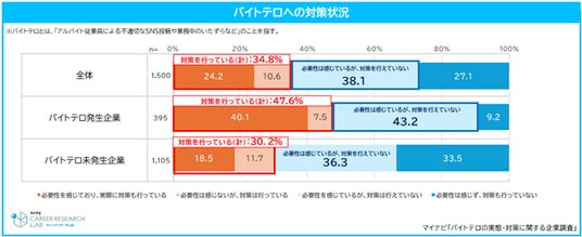企業の「バイトテロ」対策について、「必要性を感じているが、対策は行えていない」企業が38.1%で最も高く、対策を実施している企業は34.8%にとどまった。