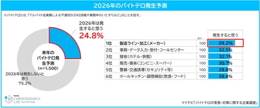 2026年に「バイトテロ」が発生すると思う企業は全体で24.8%となり、業種別では、[製造ライン・加工(メーカー)]が39.2%でもっとも高く、[事務・データ入力・受付・コールセンター]が32.5%、[接客(ホテル・旅館)]が32.1%で続いた。