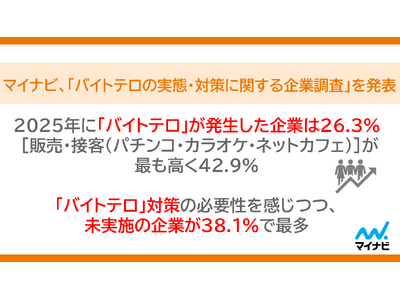 株式会社マイナビ(本社:東京都千代田区、代表取締役 社長執行役員:粟井 俊介)は、直近1年以内にアルバイト採用業務に携わった会社役員・自営業を含む20~69歳の会社員(有効回答数:1,500名)を対象に実施した「バイトテロの実態・対策に関する企業調査」の結果を発表しました。