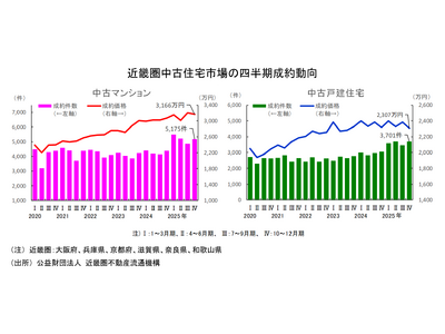 (公社)近畿圏不動産流通機構が1月21日に発表した2025年10~12月期の近畿2府4県の中古マンション成約件数は、5,175件(前年同期比プラス17.9%)と9期連続で増加し、市場の売り出し(新規登録)件数は16,984件(前年同期比プラス2.2%)となりました。成約件数は近畿圏の対象12地域中、奈良県以外の11地域が前年比で増加し、大阪府北部は8期連続、神戸市と京都市は7期連続で増加しました。
