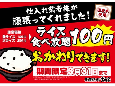 株式会社AZism(本社:東京都八王子市、代表取締役 和田 敏典)が展開する「横浜家系ラーメン大和家」は、日頃のご愛顧への感謝を込めて、2026年2月2日~2026年3月31日まで「ライス食べ放題100円(税込)」キャンペーンを実施いたします。