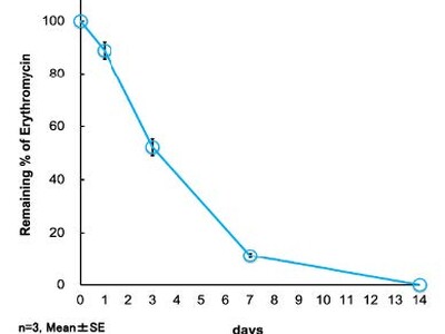 当社は、新潟大学 前川准教授との共同研究において、1週間にわたり徐々にエリスロマイシンを放出する徐放製剤を開発しました。投与直後にエリスロマイシンが1日以内に放出されてしまう「初期バースト」を約10%に抑えることができ、1週間にわたる連続した良好な徐放性が示されました。