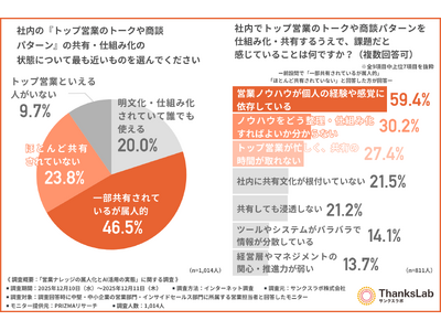サンクスラボキャリア株式会社(本社所在地:福岡県福岡市、代表取締役社長:雲井 俊太郎)は、中堅・中小企業の営業部門・インサイドセールス部門に所属する営業担当者を対象に「営業ナレッジの属人化とAI活用の実態」に関する調査を行いました。