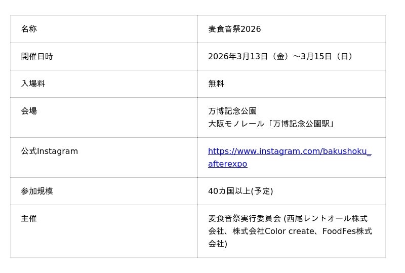 万博の閉幕を受け、その熱量とレガシーを次の時代へとつなぐ大型イベント「麦食音祭(ばくしょくおんさい)2026 ~ アフターEXPO ~」 を、2026年3月13日(金)~3月15日(日) の3日間にわたり、万博記念公園(大阪府吹田市)にて開催いたします。