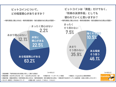 次世代決済手段としての暗号資産の可能性と導入課題、そして高額決済におけるニーズが浮き彫りにCryptoDiver運営事務局は、1.暗号資産に関心がある・暗号資産保有・取引経験がある男女/2.観光地でお店をやっている経営者・店長を対象に、「暗号資産決済の意識と導入」に関する調査を行いました。暗号資産市場の拡大とともに、決済手段としての活用にも注目が集まっています。特にビットコインをはじめとする暗号資産は、送金スピードやグローバルな利便性から、将来的な決済インフラの一端を担う可能性を秘めています。一方で、実際に消費者や事業者は暗号資産決済に対してどのような意識を持っているのでしょうか。利便性や信頼性、高額決済への対応といった観点での期待や不安は、どのようにわかれているのでしょう。そこで今回、CryptoDiver運営事務局(https://crypto-diver.com/)は、1.暗号資産に関心がある・暗号資産保有・取引経験がある男女/2.観光地でお店をやっている経営者・店長を対象に、「暗号資産決済の意識と導入」に関する調査を行いました。調査概要:「暗号資産決済の意識と導入」に関する調査【調査期間】2025年12月24日(水)~2025年12月26日(金)【調査方法】PRIZMA(https://www.prizma-link.com/press)によるインターネット調査【調査人数】1,012人(1.601人/2.411人)【調査対象】調査回答時に1.暗号資産に関心がある・暗号資産保有・取引経験がある男女/2.観光地でお店をやっている経営者・店長と回答したモニター【調査元】CryptoDiver運営事務局(https://crypto-diver.com/)【モニター提供元】PRIZMAリサーチ約9割がビットコインに関心を寄せる。投資対象から「決済手段」への期待も過半数はじめに、ビットコインへの関心について、暗号資産に関心がある・暗号資産保有・取引経験がある男女にうかがいました。「ビットコインについて、どの程度関心があるか」と尋ねたところ、約9割が『非常に関心がある(22.5%)』『ある程度関心がある(63.2%)』と回答しました。暗号資産に関心がある・暗号資産保有・取引経験がある方の大多数が、ビットコインに対してポジティブな関心を持っていることがわかります。では、ビットコインの用途についてはどのように考えているのでしょうか。「ビットコインは『資産』だけでなく、『将来の決済手段』としても使われていくと思うか」と尋ねたところ、約6割が『強くそう思う(10.5%)』『ある程度そう思う(46.1%)』と回答しました。ビットコインは単なるブームの段階を超え、より実用的なフェーズへ移行していくと思われていることが示されました。また、多くの方が「将来の決済手段」としての可能性を肯定している背景には、既存の金融システムに対する補完的な役割への期待があると考えられますが、「そう思わない」という声も一定数見られ、実社会への浸透にはまだいくつかの壁が存在していることも浮き彫りになりました。暗号資産決済のイメージは「リスク」と「先進性」が混在。金額上限なしに魅力を感じる方は7割に到達暗号資産決済の社会実装が進む中で、どのようなイメージが先行しているのでしょうか。引き続き、暗号資産に関心がある・暗号資産保有・取引経験がある男女に聞きました。「ビットコインなどの暗号資産で支払いができる決済について、どのような印象を持っているか」と尋ねたところ、『リスクが高そう(40.3%)』と回答した方が最も多く、『まだ現実的ではない(30.8%)』『先進的で面白そう(29.6%)』と続きました。ネガティブな懸念とポジティブな期待が拮抗していますが、金額の上限がなく世界中で利用できるとしたらどの程度の方が魅力を感じるのでしょうか。「もし金額の上限がなく、24時間365日、世界各国どこからでも利用できる暗号資産決済があった場合、事業にとって魅力的だと感じるか」と尋ねたところ、約7割が『非常に魅力的だと思う(19.5%)』『やや魅力的だと思う(51.4%)』と回答しました。「金額の上限なし」「24時間365日稼働」といった暗号資産決済があった場合、魅力を感じる方が多いことがわかりました。では、現在主流となっているクレジットカード決済などの金額の上限について、不便さを感じたことがある方はどの程度いるのでしょうか。「現在クレジットカード決済などの決済金額の上限について、不便さを感じたことはあるか」と尋ねたところ、約4割が『頻繁に感じる(7.8%)』『ときどき感じる(31.8%)』と回答しました。約4割が決済金額の上限に不便を感じているという結果は、高額な商品購入やビジネスシーンにおける支払いの際、既存のクレジットカード決済などの金額の上限が障害となっている現状を反映していると考えられます。決済の失敗や制限は、消費者にとっては購買意欲の減退、事業者にとっては成約機会の損失に直結しかねない課題です。インバウンド客の「客単価向上」に約8割の経営者・店長が期待!暗号資産決済が観光消費を加速させる可能性では、観光現場を担う経営者側は、暗号資産決済の導入による