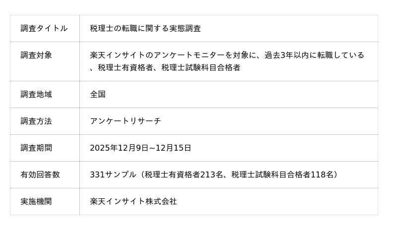 https://www.career-adv.jp/)は、「税理士の転職実態に関する調査」を行い、331名(税理士213名、科目合格者118名)の有効サンプルを集計しました。調査にあたっては楽天インサイト株式会社(https://insight.rakuten.co.jp/)のアンケートパネルを活用しております。