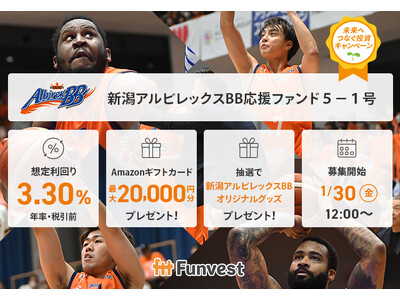「未来をわかちあう投資」を提供する「Funvest(ファンベスト)」(以下、Funvest)は、「新潟アルビレックスBB応援ファンド5-1号」(以下、本ファンド)の募集を1/30より開始しますので、お知らせいたします。