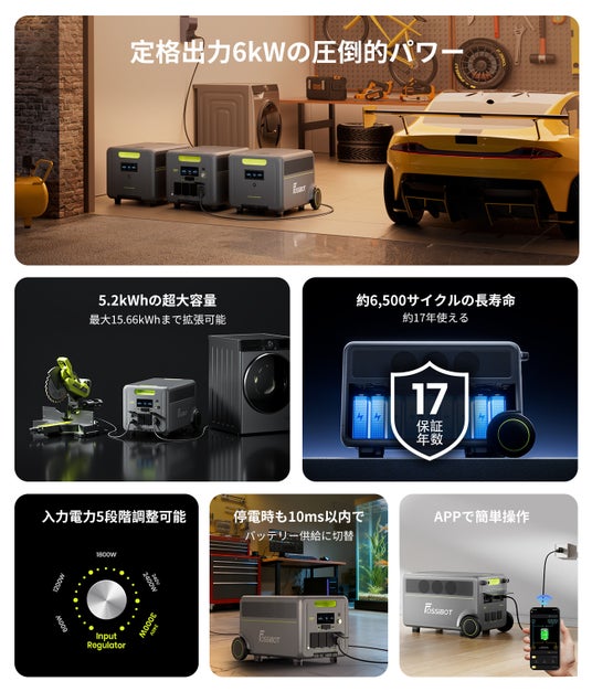 防災・停電対策から業務用途まで対応。FOSSiBOTは、超大容量・高出力を実現した次世代ポータブル電源 「F7200(容量5222.4Wh/定格出力6000W)」 を新発売いたしました。