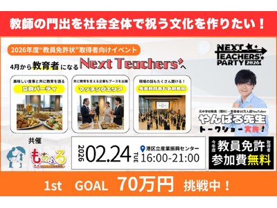 一般社団法人もあふると学生団体TeacherAideからなる「Next Teachers' Party実行委員会」は、2026年2月24日(火)に開催する新人教員応援イベント『Next Teachers' Party 2026』の運営資金およびコンテンツ拡充費用を募るため、2026年1月24日(土)より、クラウドファンディングプラットフォーム「For Good」にてプロジェクトを開始いたしました。