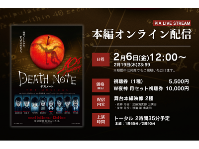 本日1月25日(日)に岡山公演にて大千穐楽を迎える『デスノート THE MUSICAL』の舞台本編映像が2月6日(金)12:00よりPIA LIVE STREAMにて配信決定。配信最終日・2月19日(木)まで何度でも視聴可能。視聴券は2月19日(木)20:30まで絶賛販売中!