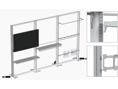 【風雅 FU-GA】自立式連結タイプは、ガチャ受け仕様のフレームに多様なオプションパーツを組み合わせることでモニター設置の他、商品ディスプレイ用の棚板やハンガー陳列用ステーも組み込み可能です。売場の常設演出の他、コーナー化やポップアップショップの空間デザインの幅を広げます。イベントやシーズン終了後、フレームや各種パーツ及びスクリーンは分解して省スペースで保管でき再利用可能なのでサスティナブル性にも優れた新素材です。