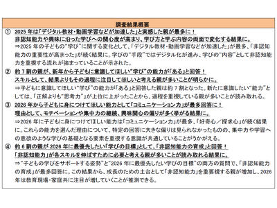 その結果、新年の教育方針として約7割の親が「2026年はこれまでと違った子どもの学びを意識したい」と回答し、特に重視する点として、結果そのものよりも「思考力」「挑戦する姿勢」と、取り組み方へ軸足が移っていることが明らかになりました。また、2026年の最優先の学び目標は「非認知能力の育成」がトップとなったことからも、成長のための土台作りを意識している親が多いことが読み取れる結果となりました。