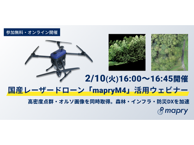 地理空間情報アプリプラットフォーム「mapry」を提供する株式会社マプリィ(本社:兵庫県丹波市、代表取締役:山口圭司、以下マプリィ)は、2026年2月10日(火)に、国産レーザードローン「mapryM4」および解析プラットフォームを活用した無料ウェビナーを開催いたします。