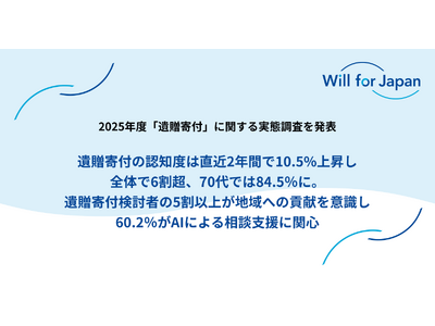 一般社団法人日本承継寄付協会 / Will for Japan(所在地:東京都文京区、代表理事:三浦美樹、以下「当協会」)は、6回目となる2025年度の遺贈寄付に関する実態調査を実施しました。本調査の結果、遺贈寄付に関する全体的な認知度は年あたり約5%ずつ上昇して6割を超え、70代では84.5%と判明しました。加えて、遺贈寄付検討者の5割以上が遺贈先を選択する際に地域の団体を選ぶ傾向が明らかとなり、地域貢献への意識の高まりが顕著となりました。また、遺贈寄付検討者の60.2%がAIによる相談支援に関心を示しています。