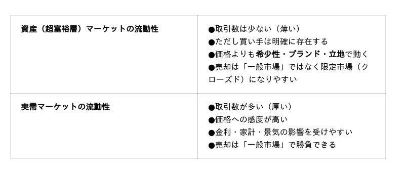 新築市場が実需と投資(資産)に二層化しているなら、流動性も同じように二層化します。